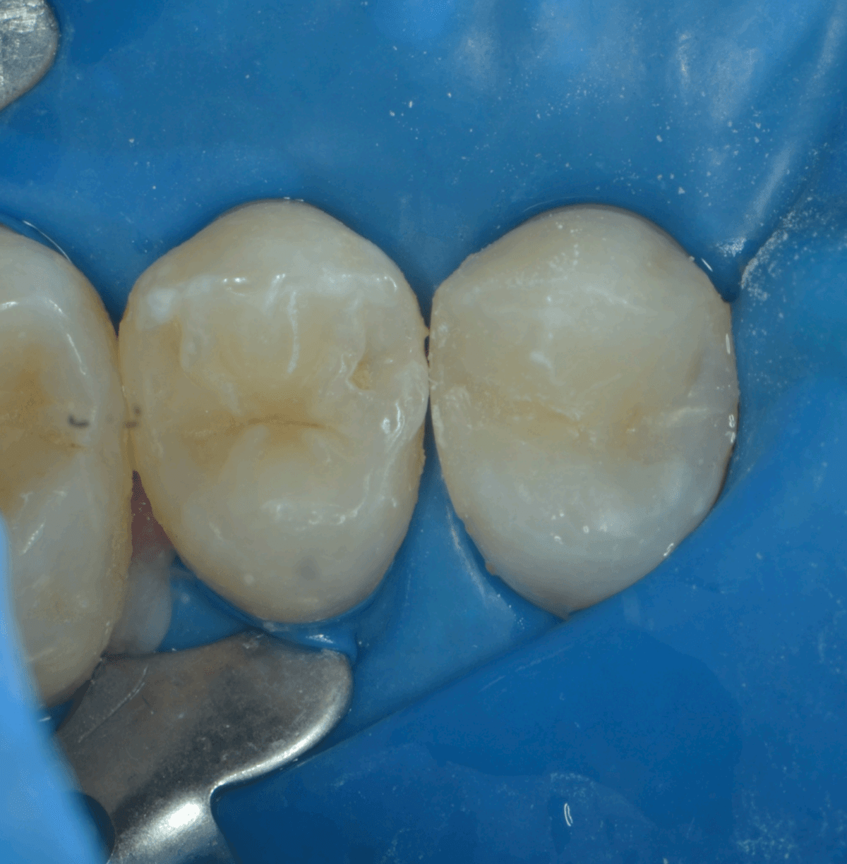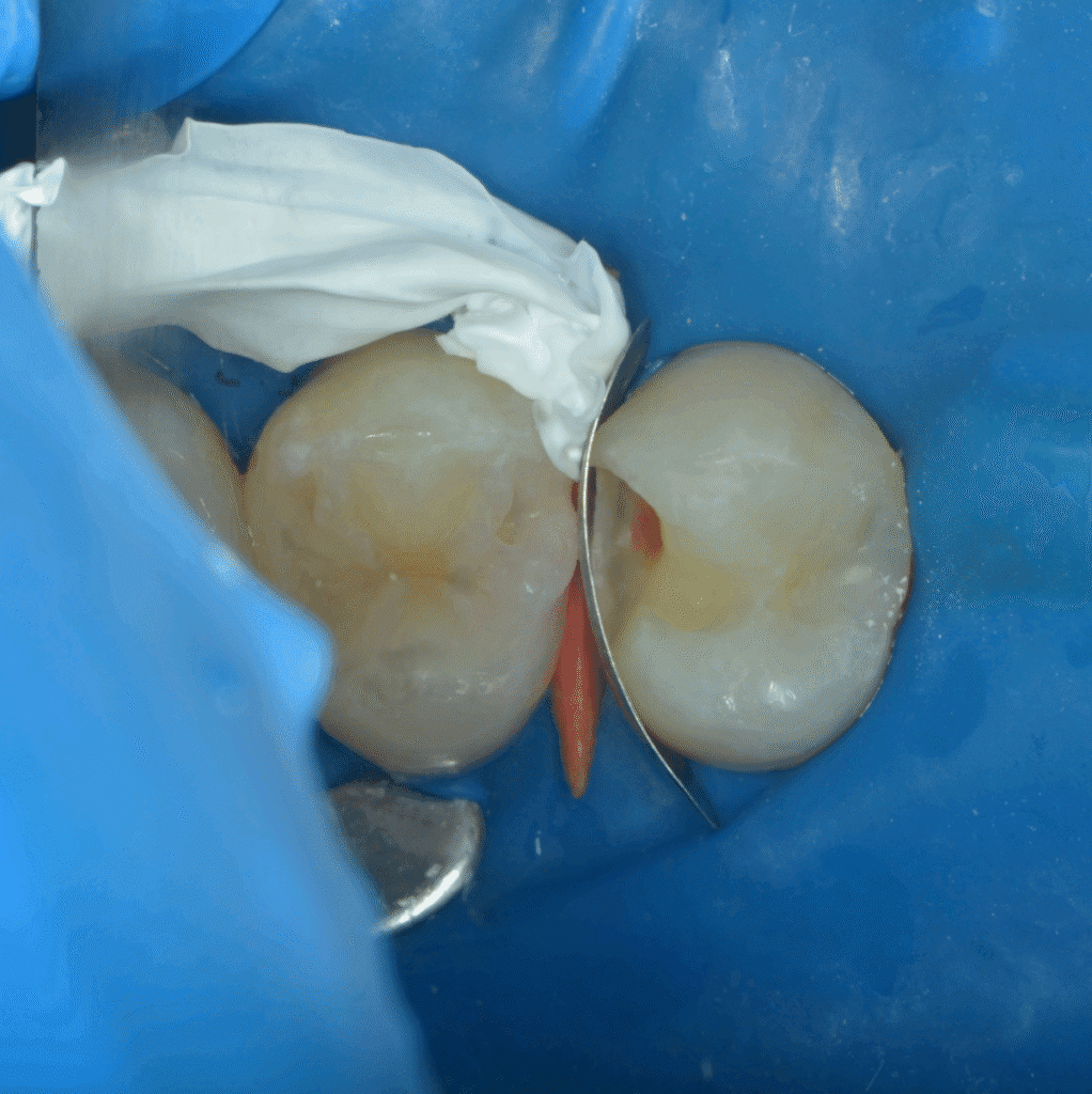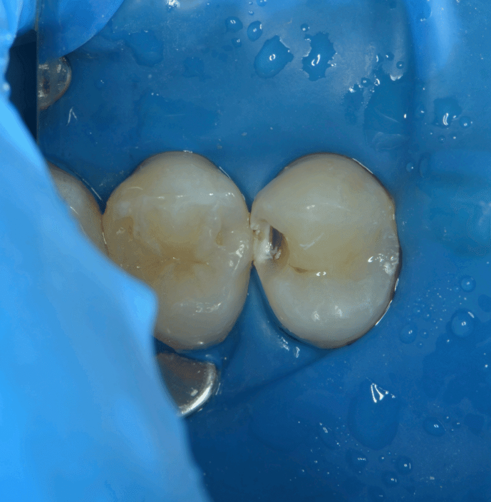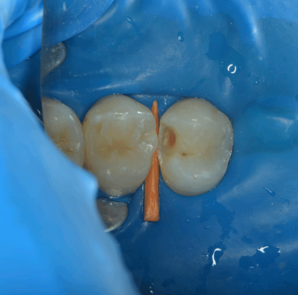 La clinica stomatologică MB Dental din Târgu Mureș, tratăm fiecare carie cu precizie, utilizând microscopul dentar pentru a identifica și elimina complet țesuturile afectate. În acest caz, pacientul s-a prezentat cu o carie interdentară localizată între premolarii superiori, o zonă dificil de accesat și frecvent afectată de acumularea resturilor alimentare.